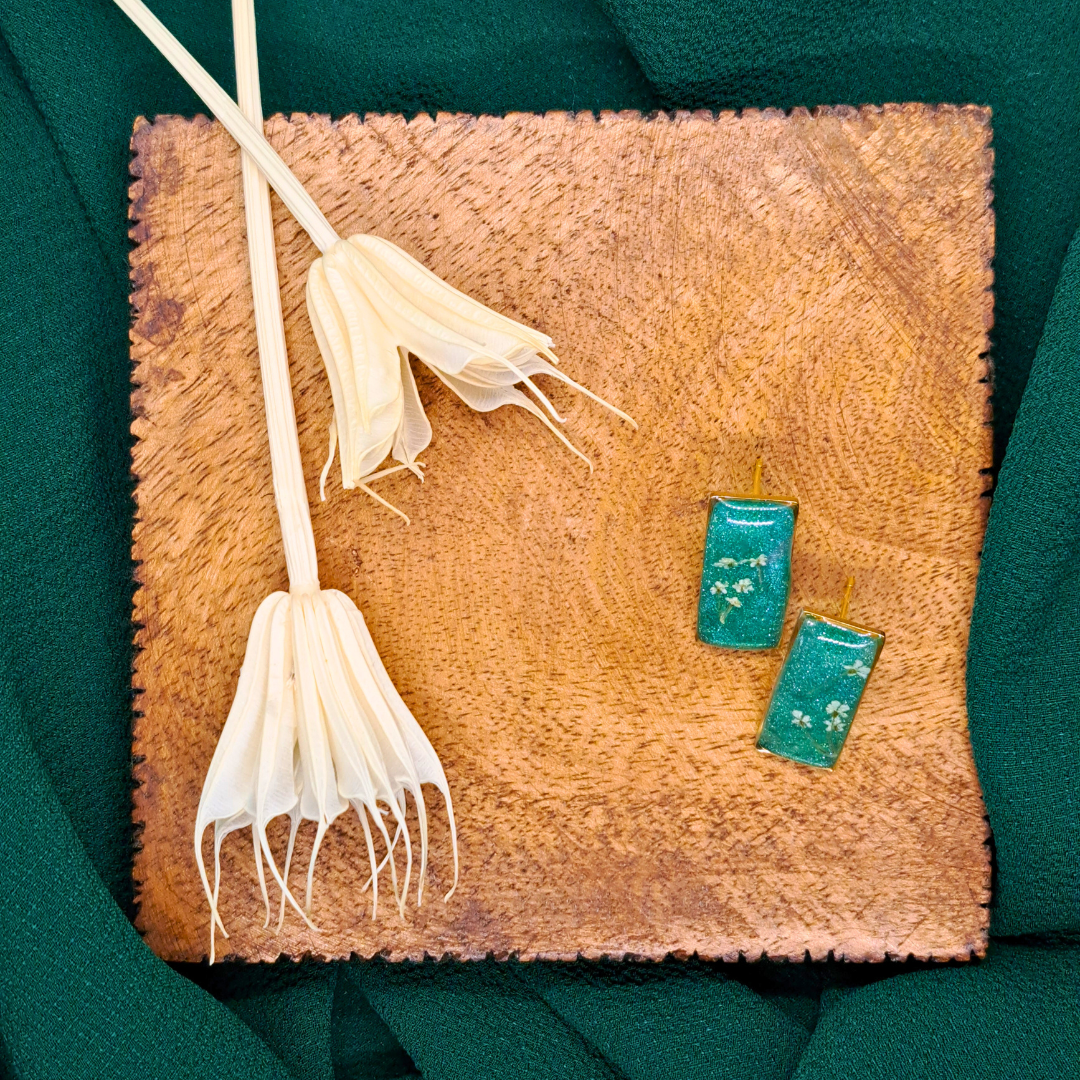 Small Rectangle Stud Earring - Real White Pressed Flowers in Green Resin Set in Gold-Plated Stainless Steel