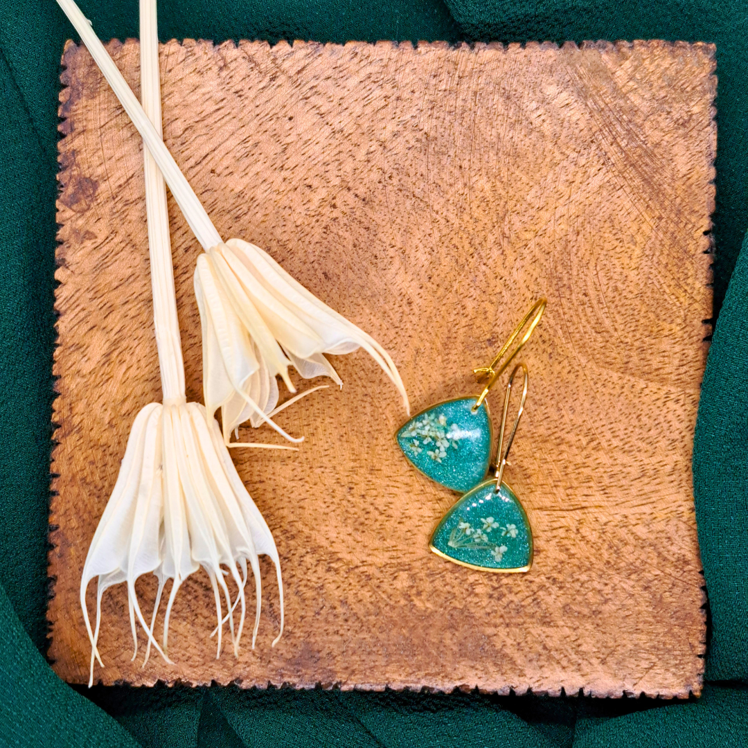 Small Curved Triangle Dangle Earring - Real White Pressed Flowers in Green Resin Set in Gold-Plated Stainless Steel